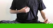 Zit in kleermakerszit. Laat de toppen van je wijsvinger en duim elkaar raken. Plaats je linkerhand op je linker knie, en je rechter hand voor het onderste deel van je borstbeen.